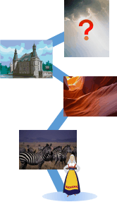 また、最終目的地へ行く途中の道は、変化に富んだものであり「行きたくなる場所」にしたい。それにより、最終目的地の価値があがると考えている。具体的には途中のステージは「世界の七不思議」をモチーフにする。ピラミッドとか空中庭園とかそういったものである。伝説の建造物をモチーフにすることで、それがこのゲームでどのように解釈されるかを想像して楽しむのもアリである。また、七不思議にした理由の1つとして「謎解き」がある。世界の七不思議には、ぞれぞれ謎が隠されており、それを解くことで最終目的地へ近づくといったものである。